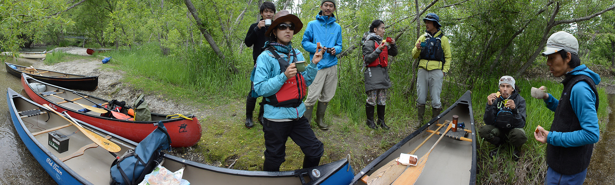 釧路川源流部チビカヌーミーティング 2017年6月19日(月) 昨日のカヌーミーティングの賑やかさとは一転し、屈斜路湖から始まる釧路川の源流部を数艇で静かに流れる。屈斜路湖畔でアウトドアガイドをしている「SOMOKUYA」土田夫妻の案内、サポートのもと釧路川チビカヌーミーティングといった感じ。透き通る水の上を進むと人の心は鏡の前に立っているよう、自分が自分の前に表れ、現れ、洗われる。透き通ってんだか跳ね返ってんだか・・・。 一昨日から一緒に行動させて頂いている南富良野のネイチャーガイド「リトル・トリー」の大野夫妻が乗っている黒いカヌーはペノブスコットという名前。夫である大野聡さんがアメリカメイン州を流れるペノブスコット川を下った想いがそのまま今この瞬間に表れているだけなのかもしれない。 「二足歩行」の藤原ジンさんは、何と言う役職だか忘れてしまったが、弟子屈町の観光やアウトドア体験などのアクティビティーをより良くするための調査や発案など、実際フィールドに出ているガイド目線で町に食い込んでいる弟子屈期待の星。 下りはじめてすぐの右岸に「鏡の間」と呼ばれている場所があること教えてもらった。そこは水がコンコン湧き出ているようなとても気持ちの良い空間。少し奥に入ると昔アイヌが居住していた跡が残っているという。ここでよし子がピンときて、「この水を広島に持っていこう」と。そう毎年8月5日に行っている広島太田川の水合わせのための水の事だ。 SOMOKUYAのツッチーこと土田さん。今回はSOMOKUYAのスタッフ純基くんと、近所のペンション「アトレーユ」のテツくんと一緒。若いエネルギーを向ける方向を導こうとするツッチーの姿が所々に表れる。途中、コーヒーの販売もしているSOMOKUYAのコーヒー&パートナーのハルちゃんが焼いてくれたケーキを川のほとりで頂いた。 陸の上でのひとときはこんな感じ。 ところでこのSOMOKUYA、そもくやと読むのだが、その名の由来を訪ねると、SOMOKUYAのベースがある側から屈斜路湖を眺めたときの風景が「そ」と「も」「く」なのだという。空の「そ」、藻琴山(もことやま)の「も」、屈斜路湖の「く」、&我が家の「や」、新しい言葉を作っちゃったのでインターネット検索も簡単だ。 お昼頃、上陸してすぐ目の前にあるカフェ&バー「COVO」でランチ。セルフビルドで建てたログハウスはとても力強くそして優しい。この家を作り上げいる姿を想像すると口がぽか〜んと開いてしまう・・・。そしてお料理もとてもおいしい人気店。 赤、青、黒。釧路川カヌーミーティング後の予定をほとんど立てないでいたのだが、こうやって川に誘ってくれる水の上の仲間がいる事が、ただただ嬉しい。みんなありがとう。 と文章を終わらせようとしたが、あれ、こちらのチビミーティングは誘われたんじゃなくて話を聞いた瞬間に「僕も行きたい。」と頼んで仲間に入れてもらったんだった・・・と思い出した。でも魂は誘われていたのだと勝手に思っている。(匠)