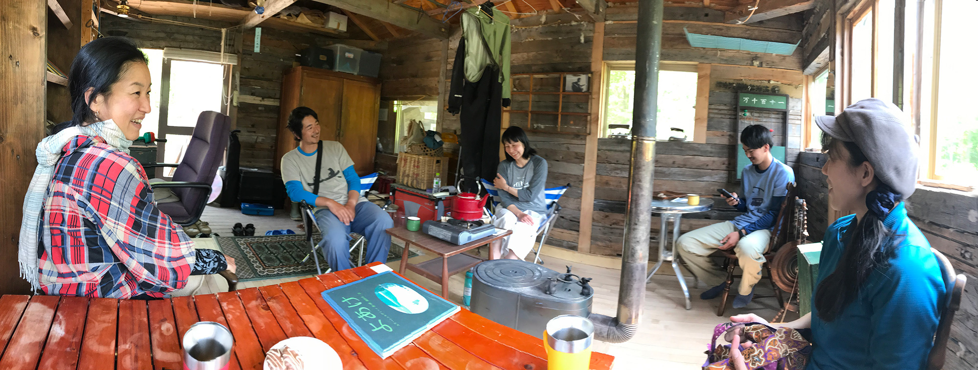 旭川〜富良野。 2017年6月23日(金) 富良野へ向かう道中に上杉ご夫妻から紹介していただいたcafe good lifeを訪れました。 「上杉さんが来たのかと思ったよ。(ハイエースにカヌーを積んでいたので)。」オーナーの渋谷さんが声をかけてくれました。建築物すべてをご自分で作っているという渋谷さんの肩書きは「楽園の管理人」。 「人の手の入っていない自然は自分にはおもしろくないんだよ、なんかそこに手を入れたくなる。そしてそれを見て満足する。するとまたこうしたくなって…。あの池はね、最初はああだったんだ。でもこうしたらと思ってこうやって。それが楽しいんだよ。」 古材を用いてご自分で建てたお店の天井には自作の木のカヌーが吊ってありました。センスのよい看板、デザイン性あふれる庭、何より渋谷さんのモノの捉え方や考え方がとても魅力的で、次々に生み出されるアイディアと実行力に刺激を受けました。 夕方南富良野にあるLittle Treeのリバーオフィスを訪れました。先日の釧路川カヌーミーティングでお会いしたLittle Tree 代表 大野聡さんがフィールドとする空知川を案内してくれました。 昨年の台風で空知川が氾濫し、南富良野の町も大きな被害を受けました。その痕跡は今も痛々しく残っています。 話に聞いていた大野さんの所有している森へ案内してもらいました。唯一のアクセスの橋が流され、その森に入るためには舟で川を渡らなければなりません。今回初めて川を渡るための道具としてカヌーを使いました。(3漕ぎくらいですが…。) 沢山の木立、開けた大地、奇麗な沢水、山菜の宝庫…。そしてここは空知川のほとり…。本当に素晴らしいところです。ここでこれができる、これがつくれる、こう過ごせる… 。どんどんイメージが湧き上がります。開拓前のはからめランドを思い起こさずにはいられません。こんなにいいところはなかなかない、誰もがそう感じる素晴らしい森です。 シーズン中の多忙な時にもかかわらず、暖かく迎えてくれた大野ご夫妻に感謝です。二人のセンスの良さとおもてなしの素晴らしさは年月をかけて磨き上げられていったもの、はじまりがあって今がある、そんなことを感じさせてくれた出会いでした。北海道に来てここに住まう人の懐の広さに感動しています。 (よ)
